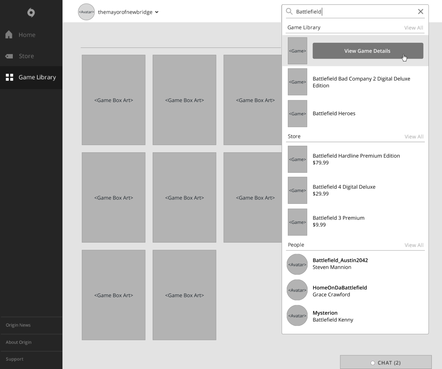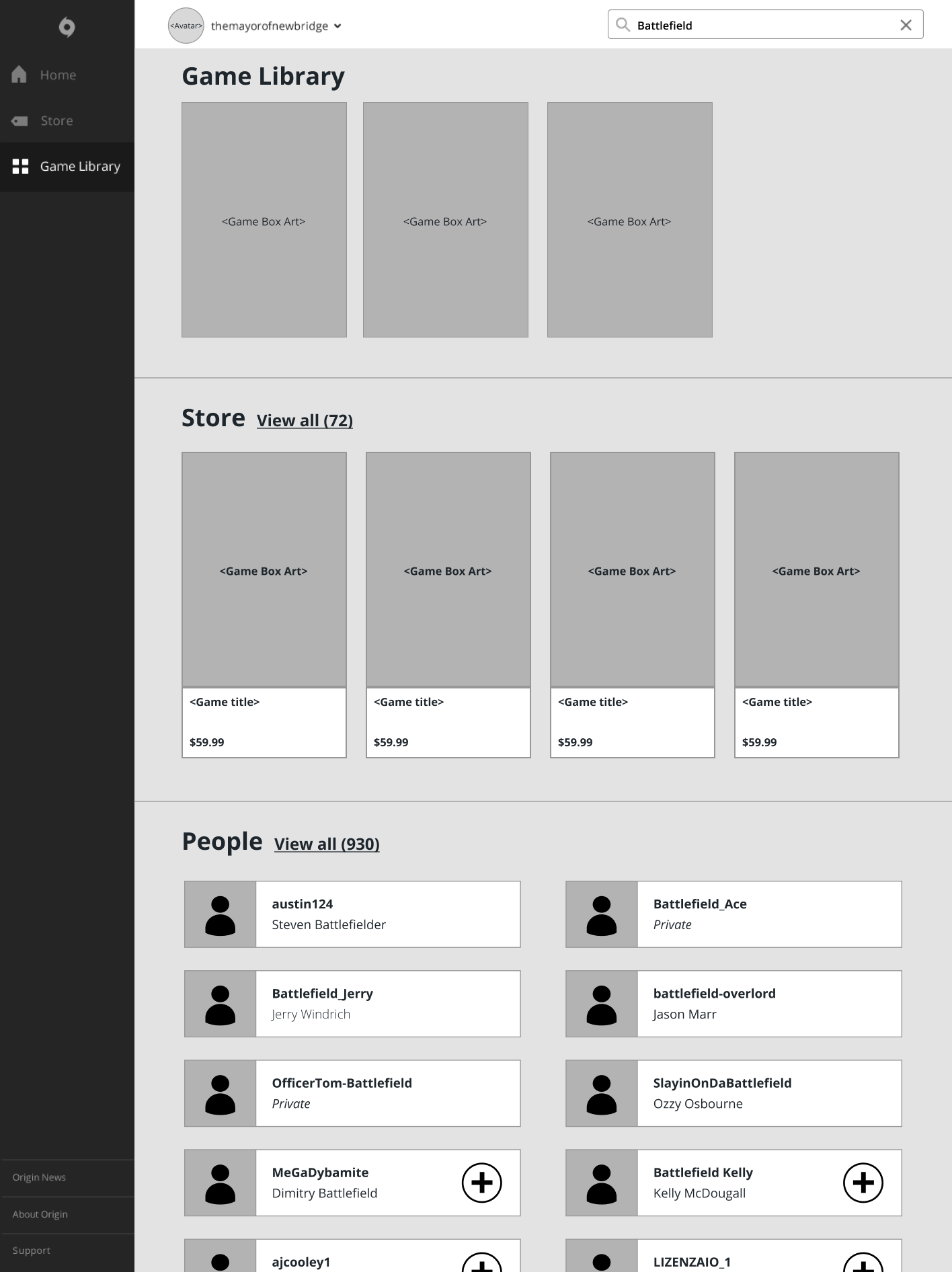 While iteration 2 was favorably reviewed by the team, we did not have the engineering bandwidth to do a dropdown and a search results page. To hit our deadline, I removed the drop-down and used a full page takeover that updated as the user typed. This is similar to iteration 1, but it would show results from each category instead of just one.